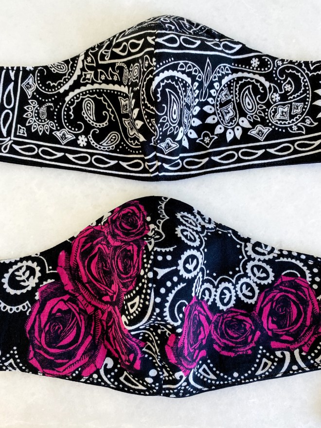 I don’t have an “inventory” of masks, every mask is handmade by me once an order is placed. I offer 2 styles, the traditional pleated mask; like what you might be given at a hospital, or what I call the “sculpted” style. The two styles are pictured below.